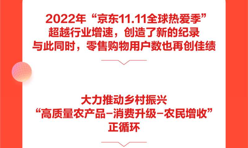 對於雙十一的成績,京東官方是這麼説的:“2022年‘京東11.11全球熱愛季’超越行業增速,創造了新的紀錄,與此同時,零售購物用户數也再創佳績。”語焉不詳,只能理解為還有增長。