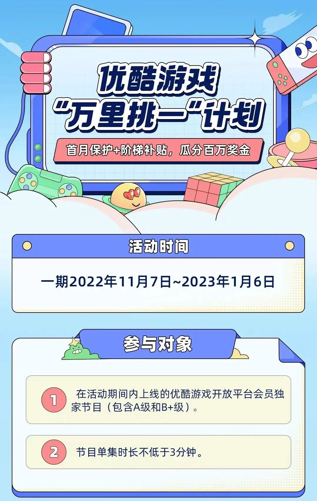 在內容生態形成的兩年後,優酷遊戲發佈了“萬裏挑一”計劃,視線放開,內容放寬,面向所有優酷遊戲開放平台會員,通過首月保護補貼和流量階梯補貼為創作者提供優質的成長環境和舞台。