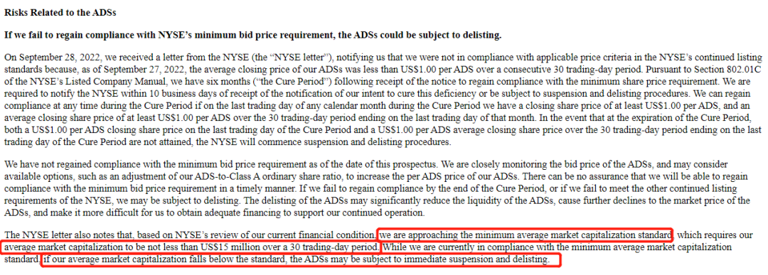 截至2022年11月18日,公司股價報收0.65美元,與最高點15.06美元相比已經跌去96%。目前,公司的總市值僅剩1921.84萬美元,紐交所的通知信函提到,除了股價,公司的市值也正在接近最低標準紅線1500萬美元,如果30個交易日內平均市值低於標準,公司可能會被立即停牌和退市。此前,第一高中教育已有先例。