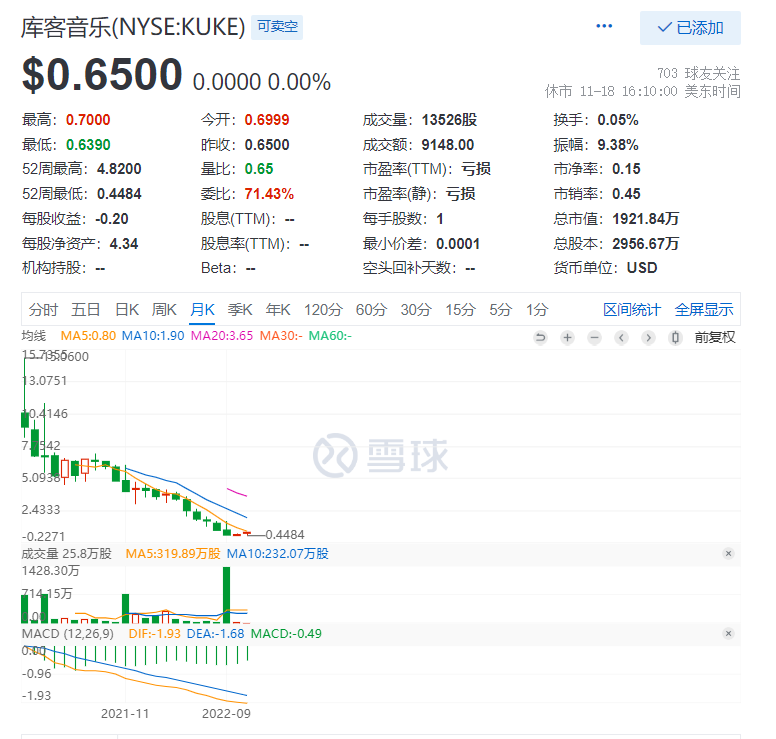 然而,在資本市場,庫客音樂卻在近期收到紐交所的退市警告,由於平均收盤價連續30個交易日低於1美元,已經觸發相關退市機制。