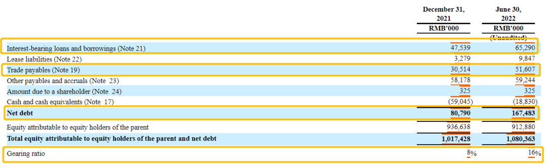 資產方面,上半年公司的債務淨額出現明顯的增長,和去年年底相比增加107%至1.67億元。截至2022年6月30日,有息貸款及借款、應付貿易款為6529萬元、5160.7萬元,與去年年底相比分別上升37.34%、69%。同時,公司的槓桿比率也由2021年底的8%上升到16%。