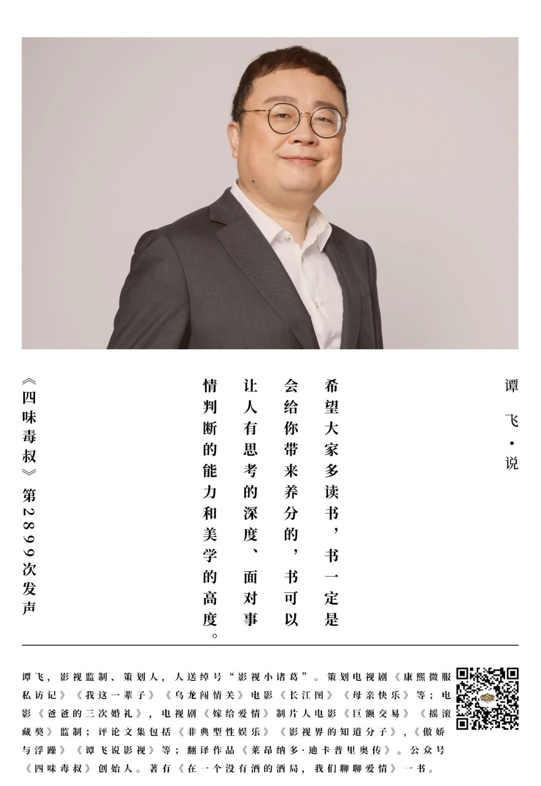 **譚飛:**我覺得書能讓一個人有深度或者迂迴的空間,如果不讀書的人會顯得淺,而且我們這個行業好像大家印象中讀書的人不多,所以我就佔點優勢,其實這是一個特別直接的話,書可以讓人有思考的深度,包括面對事情判斷的能力,或者一個美學的高度。所以我還是希望大家多讀書,書一定是會給你帶來養分的,不光是什麼黃金屋、顏如玉,其他方面也會帶來好的影響。