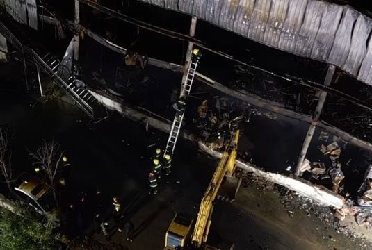 記者趕到現場後看到,整個着火區域已拉起警戒線,停了多輛消防車,架起了消防雲梯,消防救援人員還在進行着火區域的掃尾工作,整個着火的廠房已經燻黑變形,內部結構基礎設施損壞嚴重。