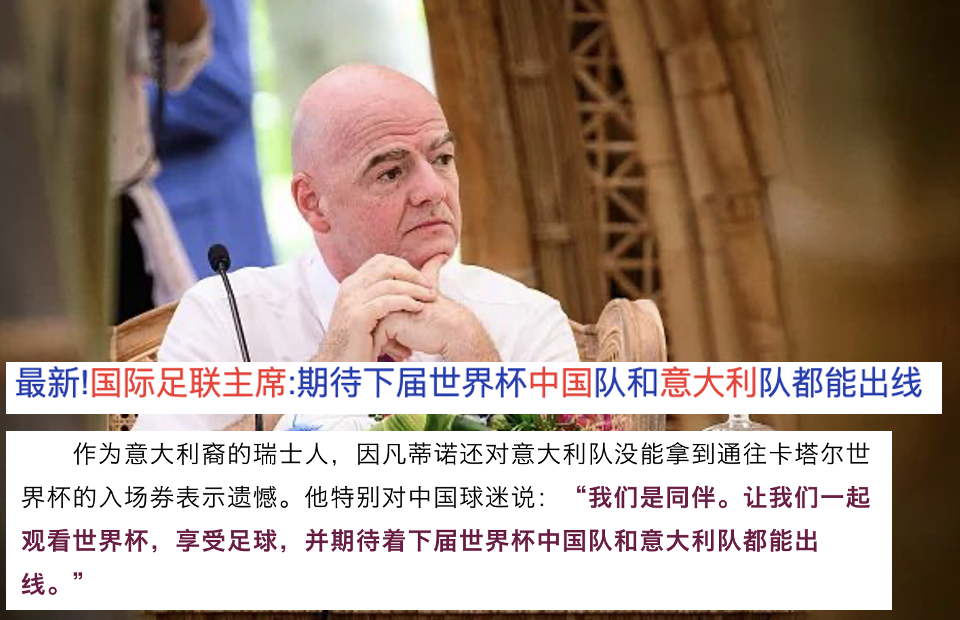 14、可惜,本屆意大利隊和中國隊都沒能出線。近期,國際足聯主席接受採訪時表示:希望下屆時意大利隊和中國隊能進。兩隊真是卧龍鳳雛,旗鼓相當啊!