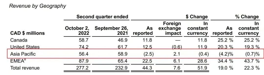 分地區看,加拿大鵝在加拿大本地、美國、歐洲、中東和非洲市場的營收均保持了兩位數以上的增長,僅中國所在的亞太地區呈現下降趨勢,且是連續兩個季度下滑。