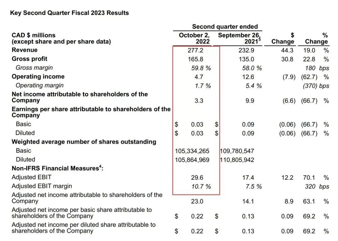 11月2日,加拿大鵝公佈了截至2022年10月2日的2023財年第二季度業績。財報顯示,加拿大鵝第二季度營收2.77億加元,同比增長19%;歸母淨利潤為330萬加元,同比下降66.7%。