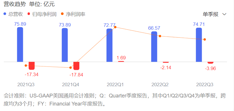 11月22日晚間,愛奇藝發佈2022年三季度財報。財報顯示,第三季度愛奇藝總收入74.71億元,去年同期為75.89億,同比下滑1.5%,預期值為10.3億美元,超出市場預期6.02%。Non-GAAP運營利潤5.24億元,較二季度的3.44億元增長53%,運營利潤率7%,去年同期運營虧損為11億、運營虧損率14%,連續三個季度實現運營盈利。截至9月30日會員數達1.06億,較6月30日增長超1000萬;季度日均訂閲會員數1.01億,環比淨增270萬。