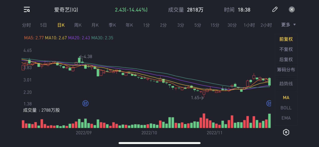 資本市場也似乎並不滿意。美東時間11月22日9時30分,愛奇藝Q3財報發佈後開盤,股價從2.84美元/股短暫衝高至2.97美元/股後,即快速下跌。截至北京時間11月23日美股收盤,愛奇藝報收2.43美元/股,大跌14.44%,總市值僅剩20.01億美元。