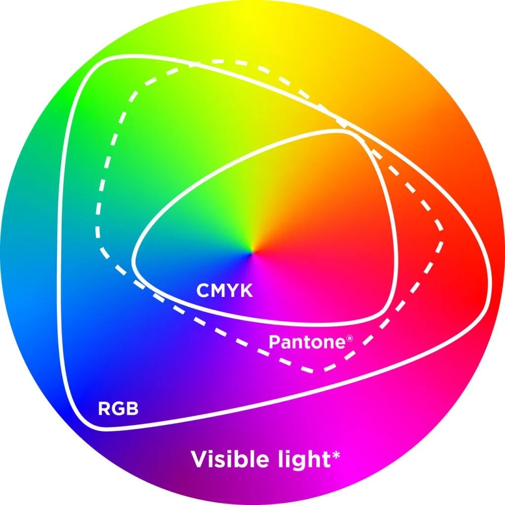 但是,很多潘通色是在 CMYK 色域之外( 比如夜光色、金屬色 ),甚至還有一部分超過了 RGB 色域。