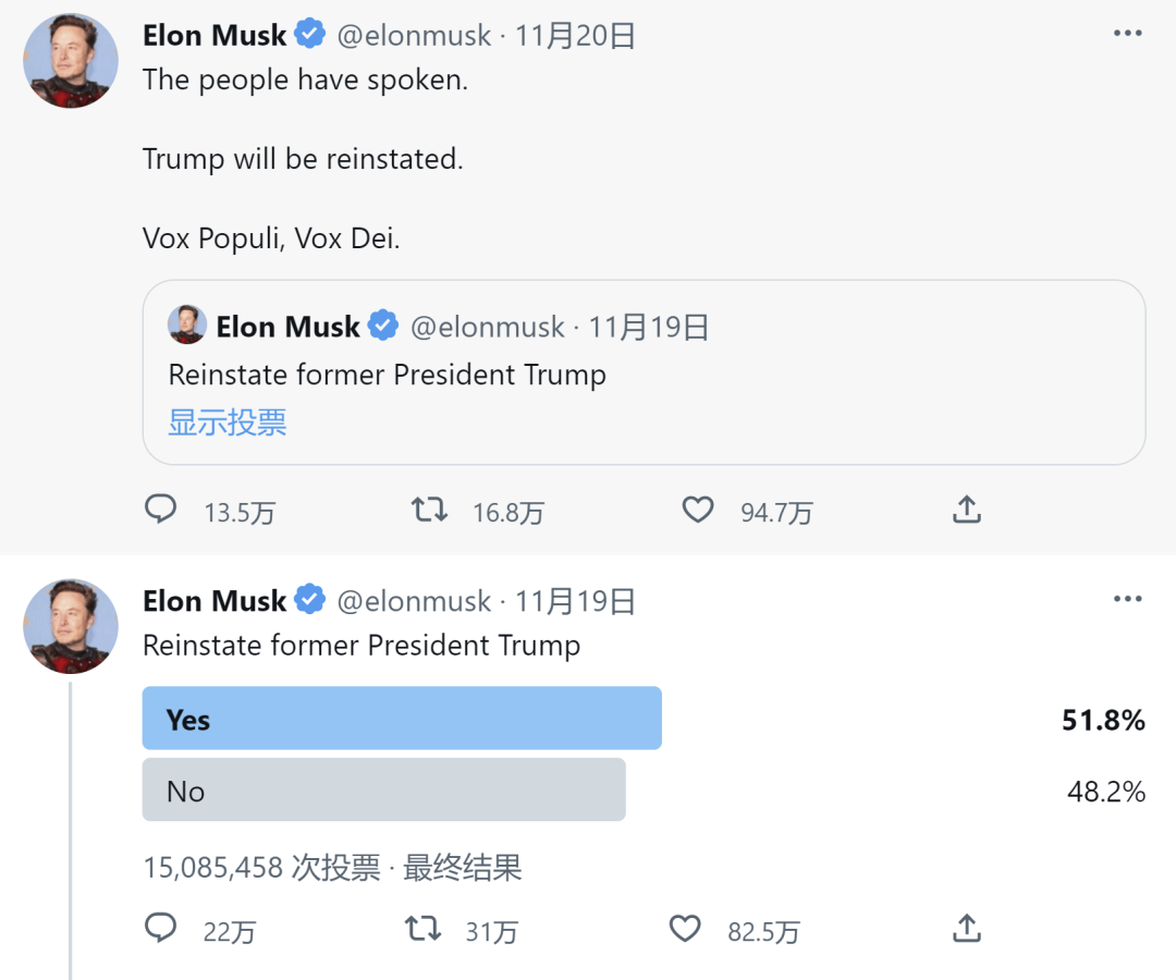 在1508萬個賬號(因為我們不知道有沒有虛假賬號)投票之後,贊成解封川普的有51.8%,於是馬斯克宣佈:「這是人民的聲音 The People have spoken」,於是川普王者歸來。