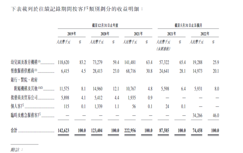 若按客户類別來分,幼兒園及教育機構的收益佔總收益的25.9%,餐飲服務供應商佔比20.1%,銀行、醫院、政府附屬機構及其他佔比8.0%,臨時及應急服務客户佔比46.0%。