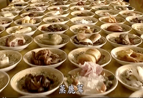 “白雲豬手、龍飛鳳舞、蜻蜓點水……蒸羊羔、蒸熊掌、蒸鹿茸、燒花鴨……”菜名報着。