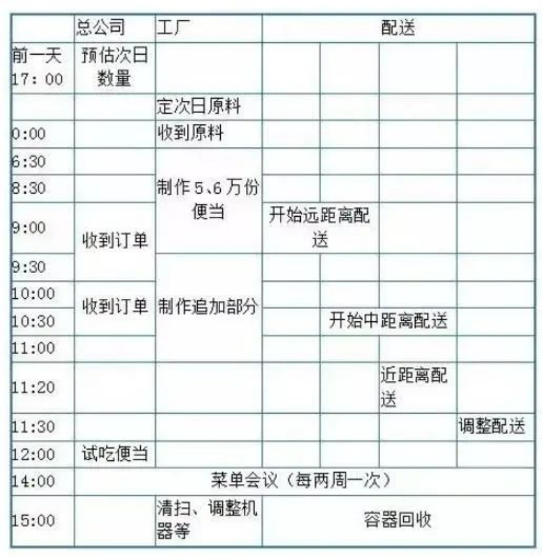 玉子屋的顧客都是事業單位的正式員工,因此配送地址和路線在交通條件不出問題的情況下,基本都是固定不變的。所以壓根不需要什麼第三方配送,直接用送貨車從工廠裝貨,然後將便當送到顧客所在的單位即可。