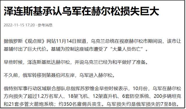 而且這種小規模接觸戰的模式,目前烏軍的損失是比俄軍更大,澤連斯基在11月14日去視察赫爾松市的時候表示,基輔為控制這座城市遭受了大量人員傷亡。