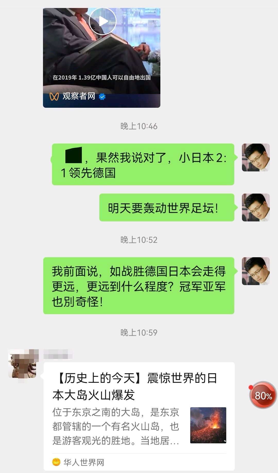 世界盃“德 、日”比賽之前本人就有一種強烈直感,認為日本為會繼沙特爆冷之後再度爆冷擊敗德國隊(附微信截圖),原因嘛,一是本次比賽在亞洲舉辦天時地利人和;