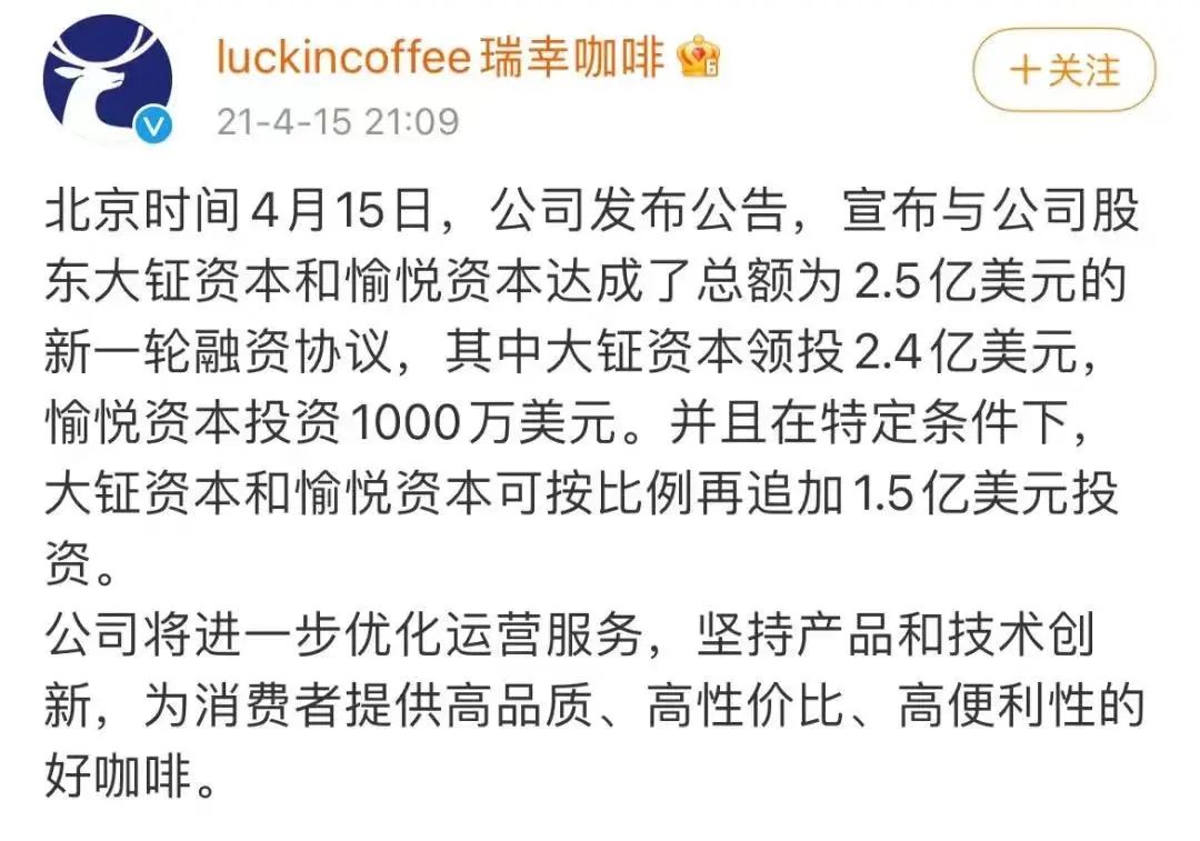 2021年,瑞幸宣佈與公司股東大鉦資本和愉悦資本達成總額為2.5億美元的新一輪融資。這輪融資將主要用於瑞幸咖啡海外債務重組計劃,以及履行與美國證券交易委員會達成的和解協議。