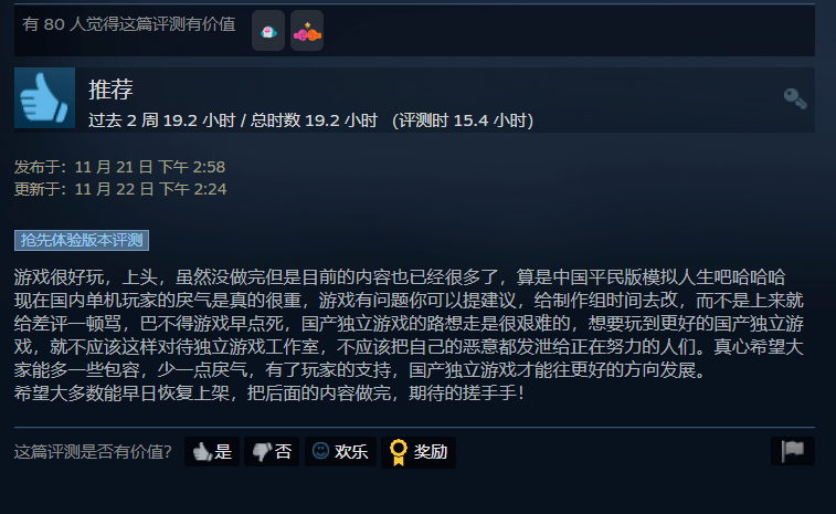 值得一提的是,雖然《大多數》遭遇了許多批評,但還是有不少為遊戲點讚的玩家,他們表示,遊戲的玩法設計還是可圈可點,作為一款模擬養成遊戲,《大多數》確實有着不錯的可玩性,這樣的遊戲完全值得肯定,他們對遊戲的不足也有着一定的包容度,有耐心等待改進和調整。