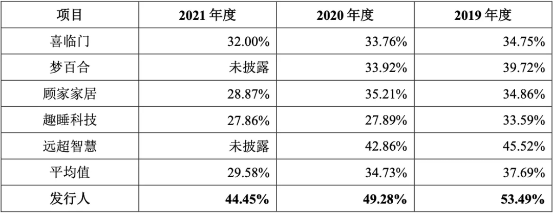 慕思的毛利也為業內最高。據招股書顯示,2019年-2021年,慕思的綜合毛利率在45%左右,高於喜臨門和夢百合及其他同行。