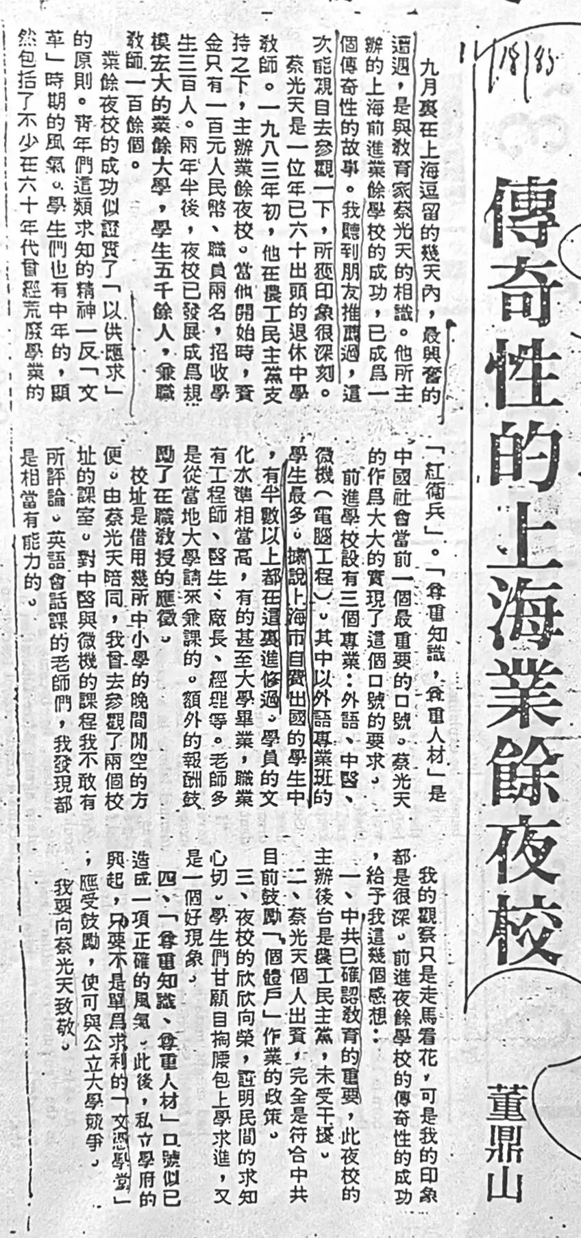文末董鼎山以平和的筆觸概括了他對蔡光天辦學的感悟,他寫道:“中共已確認教育的重要,‘尊重知識、尊重人才’的口號似已造成一項正確的風氣;夜校的欣欣向榮,證明民間的求知心切,學生們自掏腰包上學求進,也是一個好現象。”更妙的是,董把蔡光天看成了一個“個體户”,他斷言:“蔡光天個人出資,完全符合中共目前鼓勵‘個體户’作業的政策。”