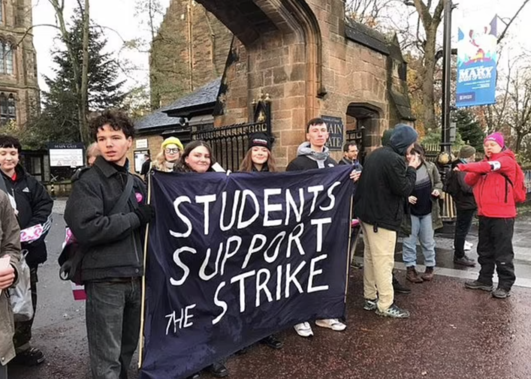 圖為格拉斯哥大學外的抗議活動,抗議者舉起“學生們支持這次罷工”的橫幅。