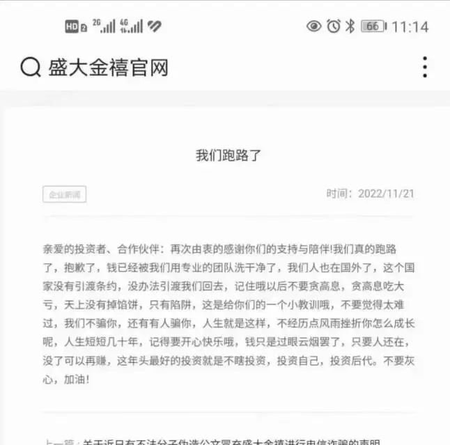 果不其然,盛大金禧跑路了,投資人欲哭無淚之餘,人家還聲情並茂地訴説:“記住哦以後不要貪高息,貪高息吃大虧,天上沒有掉餡餅,只有陷阱”。