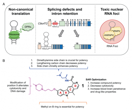 2022年11月21日,斯克里普斯研究所的研究人員在 PNAS 發表了題為:A blood–brain penetrant RNA-targeted small molecule triggers elimination of r(G4C2)exp in c9ALS/FTD via the nuclear RNA exosome 的研究論文。該研究發現了一種候選小分子藥物,能夠突破血腦屏障,選擇性消除導致漸凍症和額顳葉痴呆的C9orf72基因的G4C2異常擴增的RNA片段,並恢復漸凍症神經元和小鼠模型的健康。