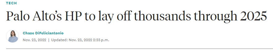 灣區華人資訊網11月24日綜合報道 近日Meta、推特和Salesforce等科技公司裁員的新聞頻頻出現在頭條,現在,又一總部尚在灣區的科技公司——惠普表示,計劃在未來兩年裁員4000至6000人。