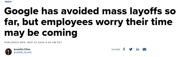 此外,這篇報道援引“瞭解該系統”人士的話稱,在以前的系統中,**管理者只需將2%的員工歸入“表現不佳”的類別。**另外一篇來自CNBC的報道則指出,在科技行業普遍裁員的情況下,谷歌公司正在調整其績效管理系統,員工們的焦慮感正日益增強。CNBC的報道中還指出,員工們擔心裁員可能迫在眉睫的原因是差旅預算的減少和獎金的減少。據悉,如果谷歌公司真的會在不久的將來裁員,那麼它將加入越來越多的灣區科技公司的行列,包括推特、優步、臉書、賽富時、惠普和DocuSign等。