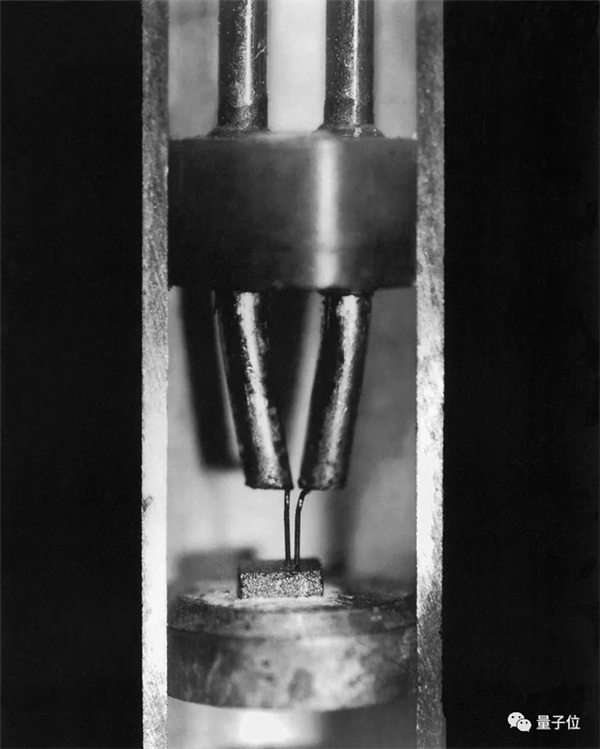 這是世界上第一枚點接觸式晶體管的原型,鑑於晶體管工作依賴於半導體材料特殊的導通性質,半導體時代也由此拉開帷幕。