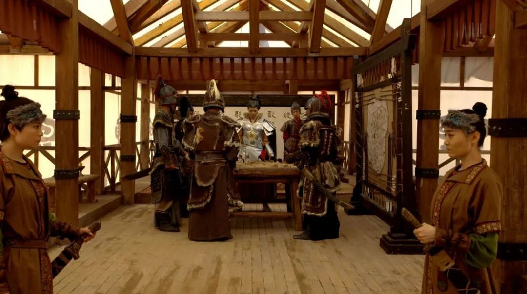 正在召開軍事會議的梁太后(穿銀白色鎧甲者),近處有兩位執行護衞任務的女兵,即所謂的麻魁(圖片來自紀錄片《神秘的西夏》)
