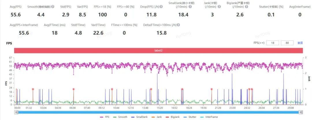 常規測試拉 30 分鐘的璃月港,獲得了 55.6 的平均幀,幀率波動算是穩健。