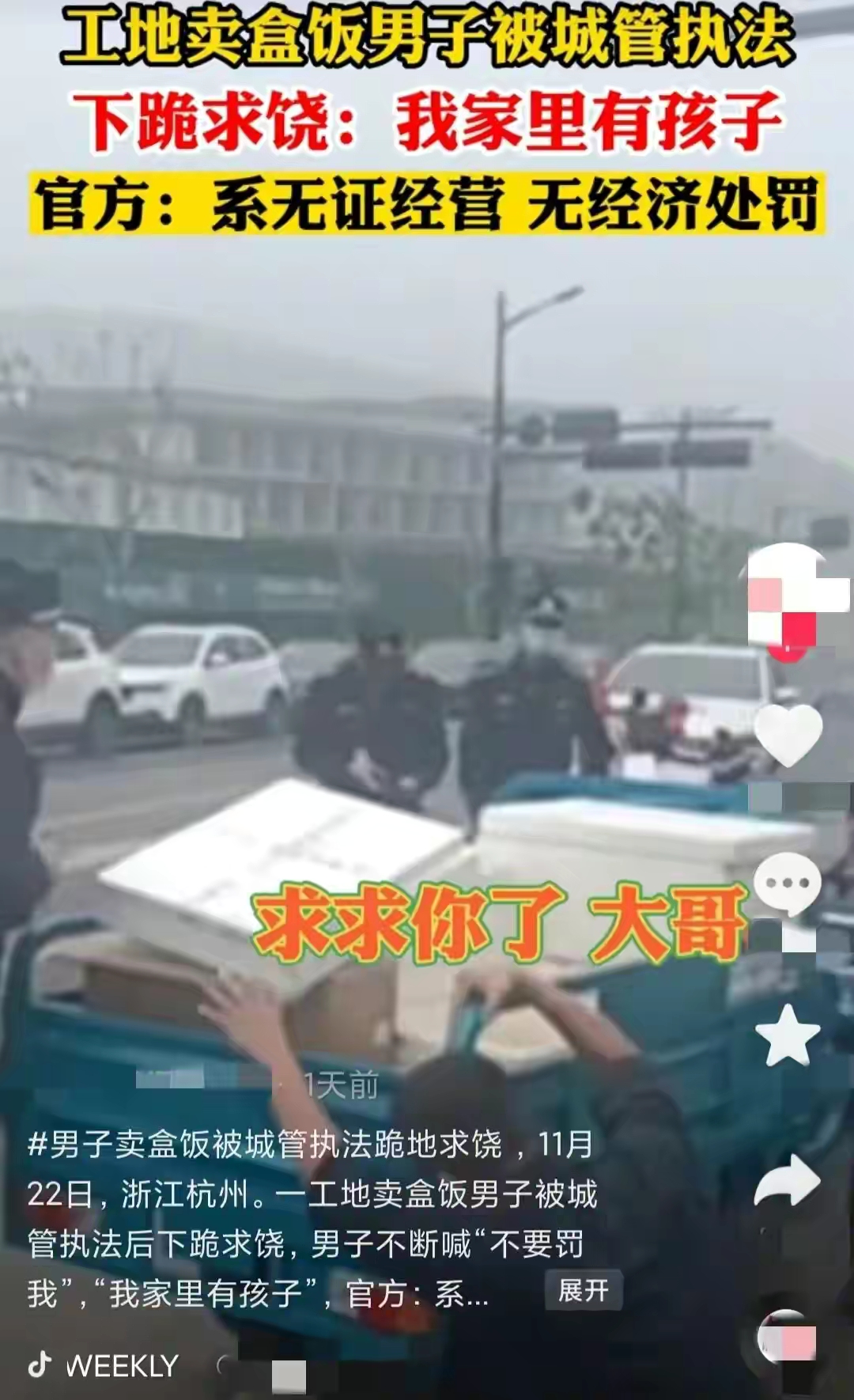 家裏孩子要吃飯,賣盒飯父親哭着給城管跪下求饒不要處罰!