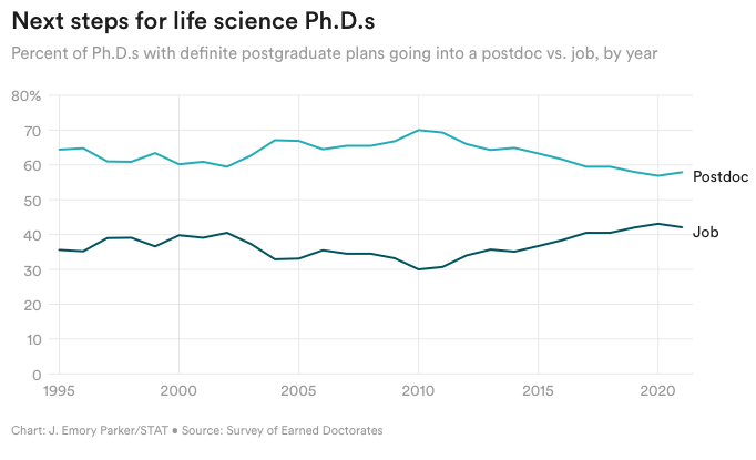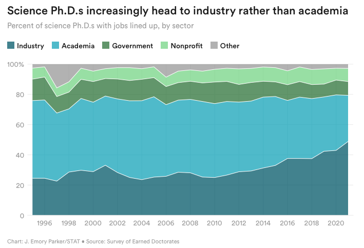 圍繞這一結構性轉變的數據“響亮”而又清晰。STAT 採訪過許多人,從在讀博士生到博士後研究員,從研究生項目主任、勞動經濟學家和生物醫藥產業的招聘經理,他們的説法也是如此。