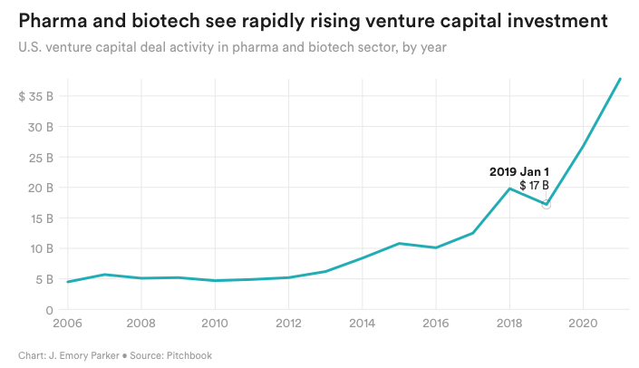 該調查並沒有明確顯示學生們從事的工作類型,而是使用“產業界”這一統稱指代任何營利性企業,用“學術界”概括描述所有教育性機構,但這一趨勢緊隨美元快速流入生物技術產業的趨勢:根據商業數據分析機構 PitchBook 的統計,2012 年製藥和生物技術公司的年度風險投資金額約為 50 億美元,而到了 2021 年這一數量增長到了 380 億美元。