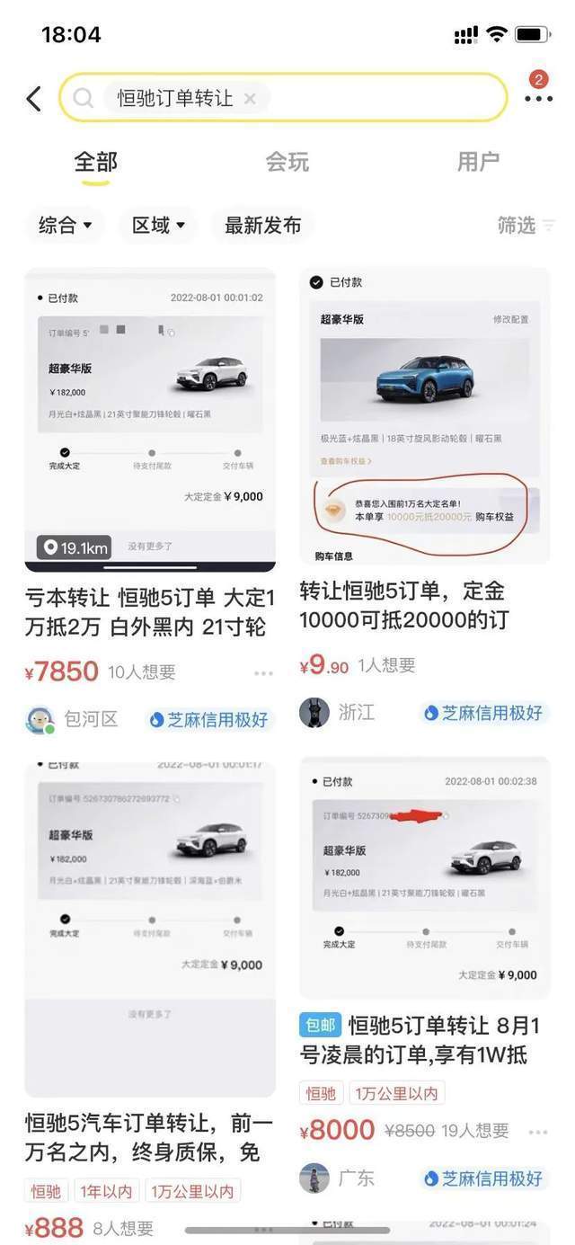 而且從消費者反饋來看,可能也不乏預訂之後又取消的車主,在閒魚上搜索相關內容,能夠看到不少轉賣恆馳5訂單的信息。