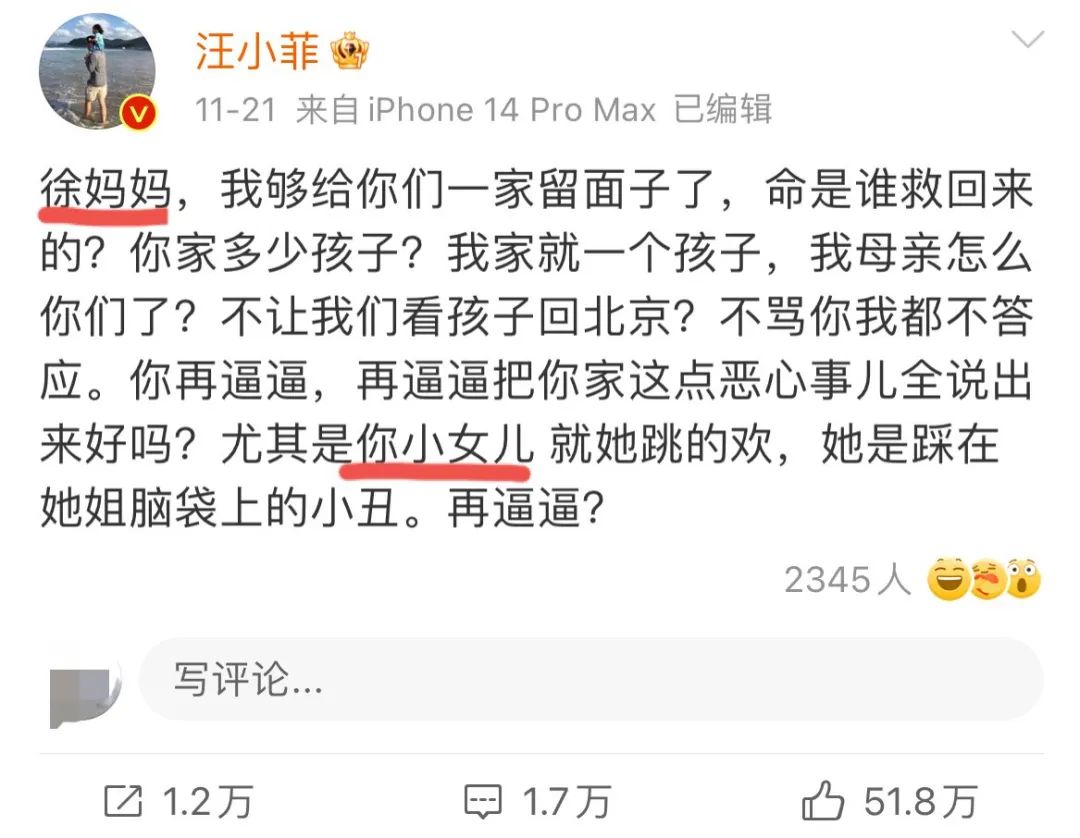 事件起因是台媒報道汪小菲不按離婚協議支付生活費引起的,於是汪小菲開始在微博發瘋。他走的第一步棋,就是曬出正面對噴的“迫害者”名單,具體有: