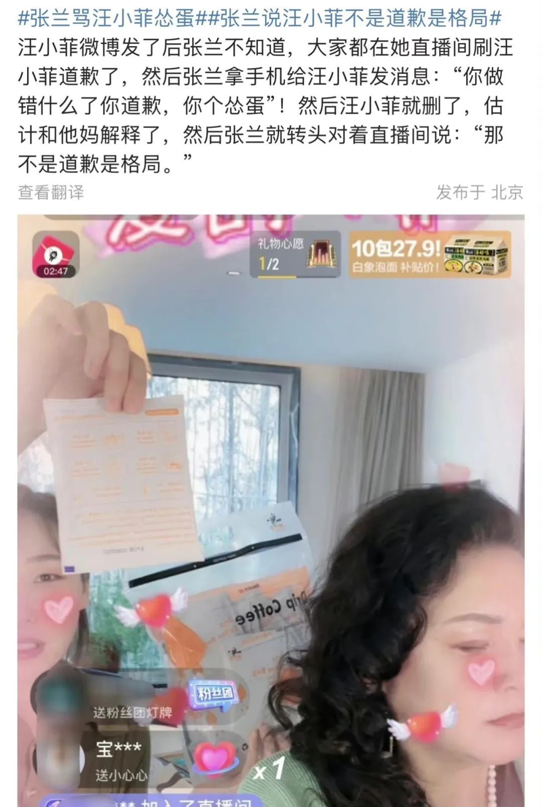 放出猛料、撰寫聲明、直播內涵,到最後看到汪小菲一會道歉一會罵街一會刪博的,張蘭乾脆破罐子破摔,直接怒噴汪小菲就是個軟蛋,汪小菲18歲以後自己和他就剩一層血緣關係了。