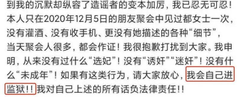 微博回應裏信誓旦旦稱,如有上述行為,“我會自己進監獄”。