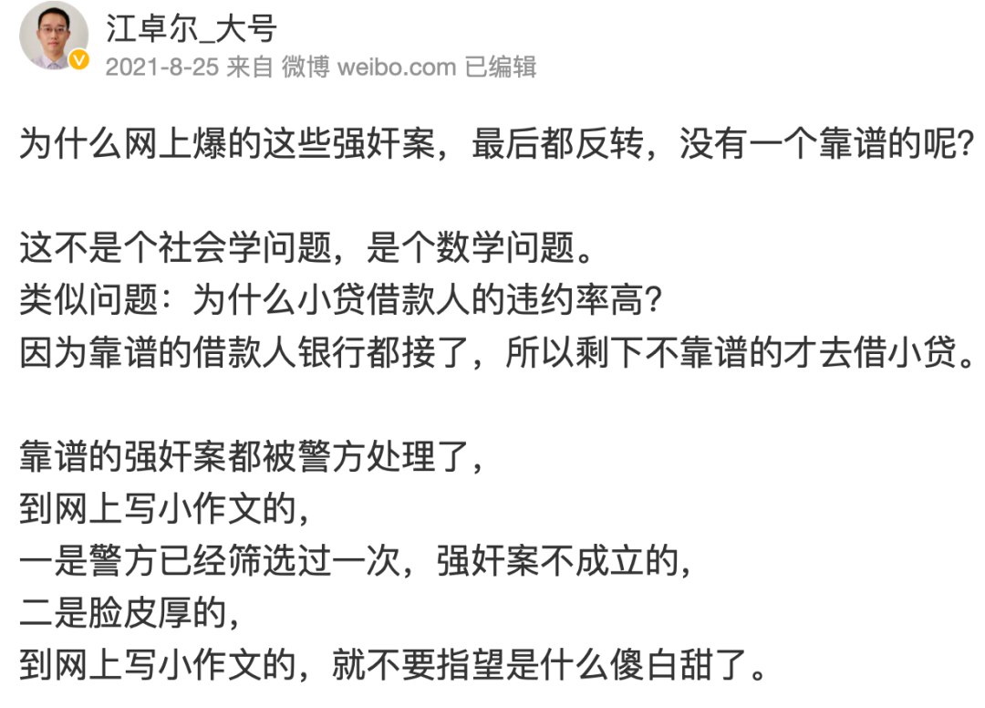 到網上寫小作文的,一是被警方篩選過一次,強姦案不成立的,二也不要指望是什麼傻白甜了(暗指心機)。