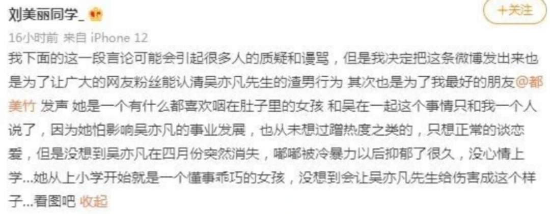網友@劉美麗同學 便以都美竹閨蜜的名義,發文稱吳亦凡和都美竹在交往期間突然消失,冷暴力女方,導致女方抑鬱,無法上學。