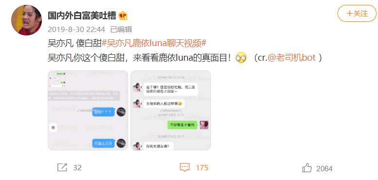 根據當時網友理解,吳亦凡對錄屏毫不知情,也就是説視頻為Luna 偷錄。