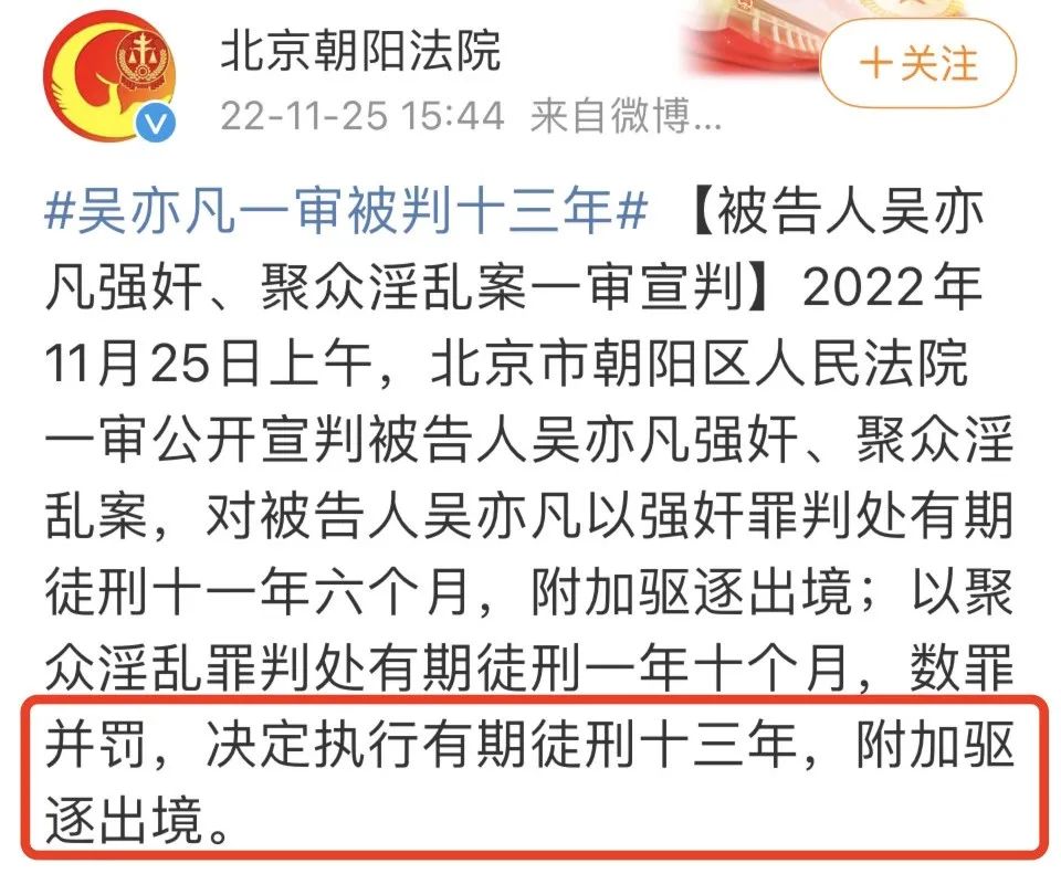 昨天上午,北京市朝陽區人民法院一審公開宣判被告人吳亦凡強姦、聚眾淫亂案。