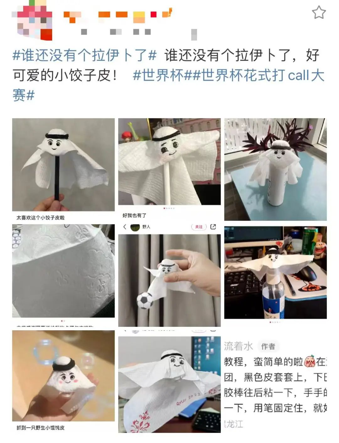 微博上,“拉伊卜可愛”“世界盃吉祥物”“世界盃餃子皮好可愛”等話題均獲得上百萬閲讀量。小紅書上,網友們開啓了“捏餃子皮”大賽——各種平替版“拉伊卜”層出不窮。