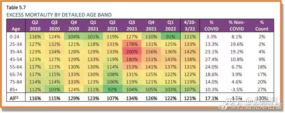 而根據北美精算師協會的報告顯示,雖然老年人因為新冠感染而死去的絕對數值高,但是老年人本身死亡率就高,所以,超額死亡率變化幅度較小。