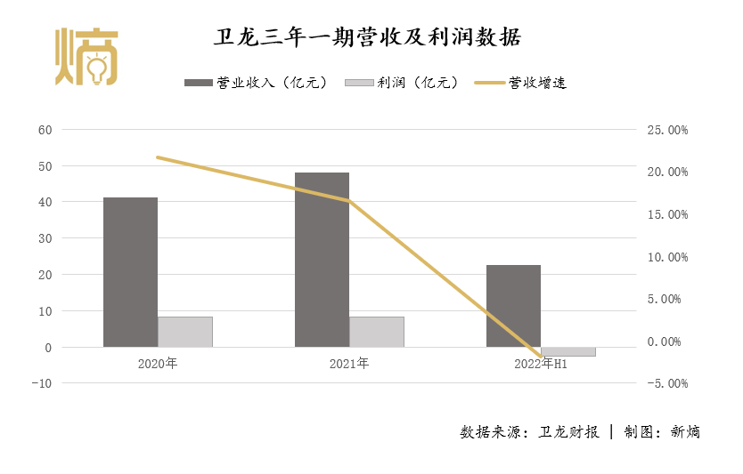 最令人頭疼的是,衞龍的營收增速正在放緩。根據招股書數據,在2019年、2020年、2021年及2022年上半年,衞龍營業收入分別為33.85億元、41.20億元、48億元及22.61億元,對應的同期利潤分別為6.58億元、8.19億元、8.27及虧損2.6億元。