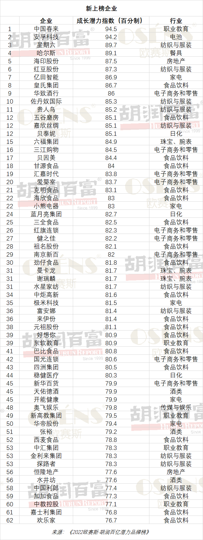 《2022歐賽斯·胡潤百億潛力品牌榜》所評估的品牌為企業總部在中國內地的本土民營品牌,無論其目前隸屬於哪個國家的公司,並且這些品牌直接面向消費者。這裏的“百億潛力品牌”2021年營收不到100億元,但已超過10億元,市值在1000億元以下。
