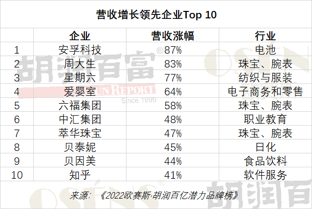 5家上榜企業營收增長超過50%,分別是安孚科技(87%)、周大生(83%)、星期六(77%)、愛嬰室(64%)和六福集團(58%)