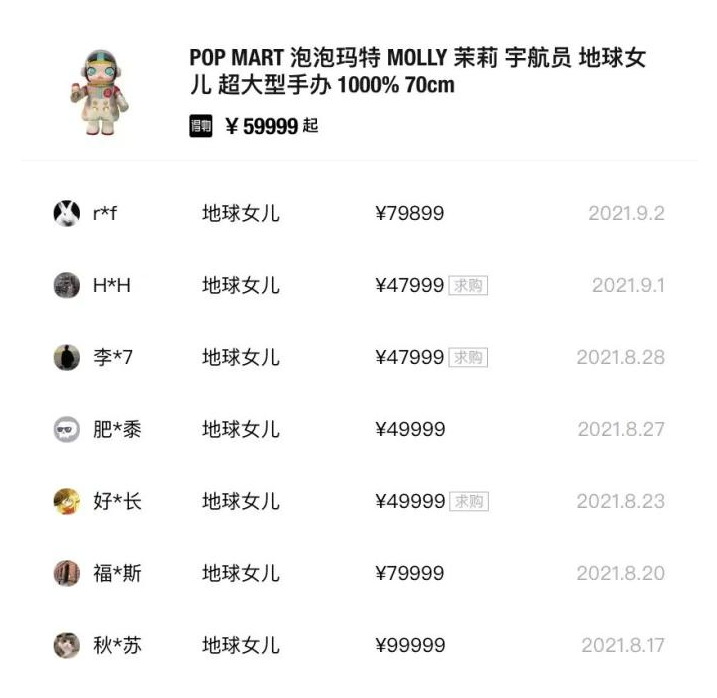 泡泡瑪特資深用户子瑞告訴我們,以前泡泡瑪特的多款產品在二手市場曾被炒出天價。以地球的女兒1000%這款產品為例,當時的發售價為4999元,限量3000件。而在去年8月時,這款產品的交易價曾被炒到10萬元,溢價率高達20倍。
