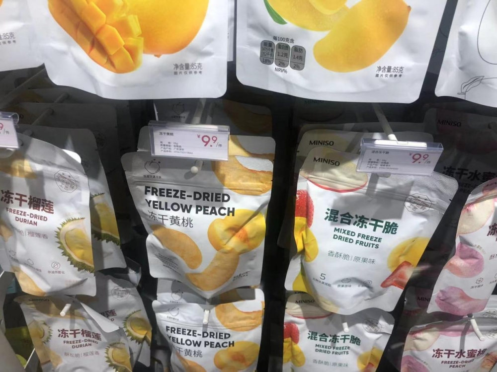 來自阜陽市的娜娜告訴我們,現在對自己而言,名創優品門店的產品買不買都可以,畢竟這些產品不是什麼剛需性產品。並且現在名創優品的產品賣的是越來越貴。比如説,名創優品25g的凍幹黃桃、85g的芒果乾售價為9.9元。