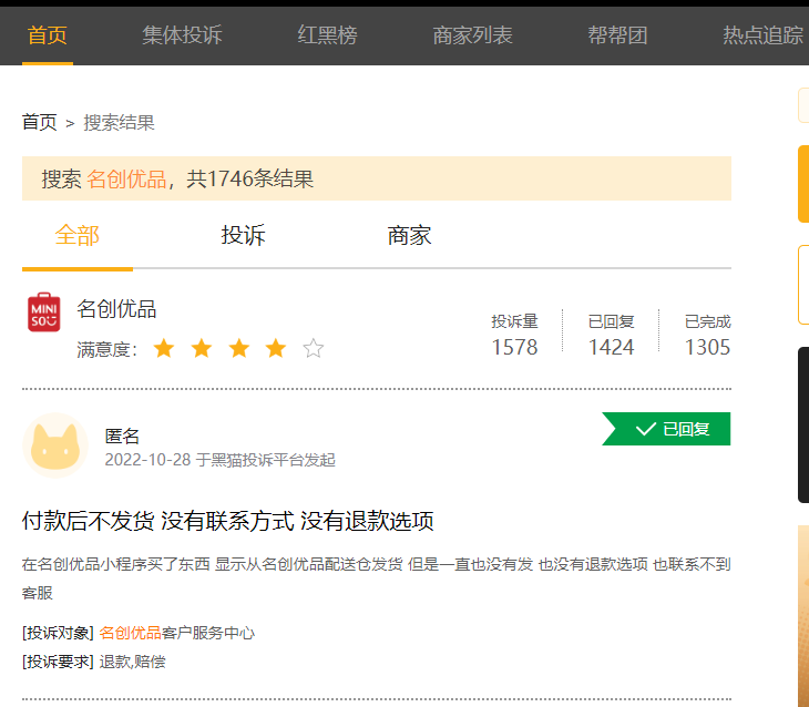 除此之外,代工模式所存在的最大問題還是品牌如何加強對於代工廠所生產產品質量的監管。目前在黑貓投訴平台上,關於名創優品的投訴已達到1578條,涉及到名創優品線上平台以及線下門店。